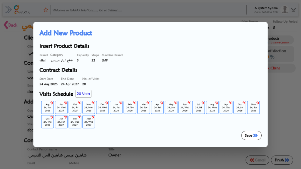 بعد إدخال تفاصيل العقد، يقوم النظام تلقائيًا بإنشاء جدول الزيارات (في هذه الحالة 20 زيارة).